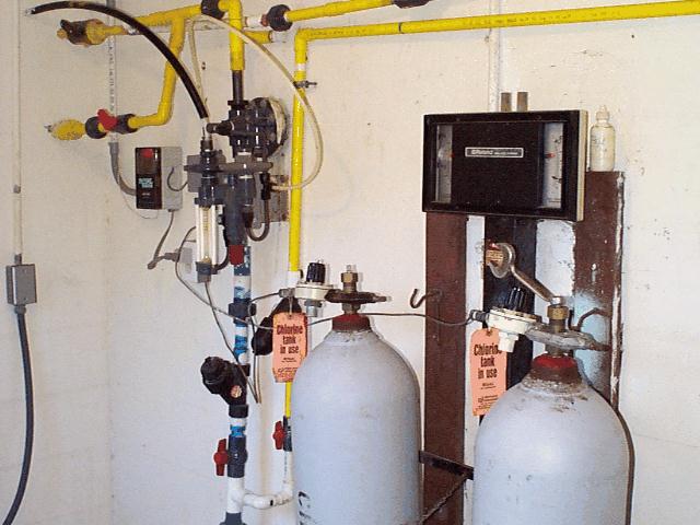 Storage cylinders (p455) contain the chlorine gas that serves as the disinfectant. |